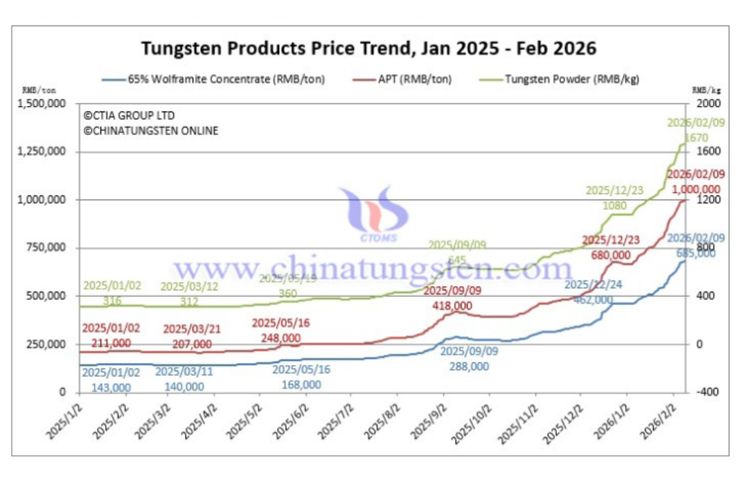 APT price rise shown in red (RMB/ton) within CTIA’s “Tungsten Products Price Trend, Jan 2025 – Feb 2026.” Source: China Tungsten Industry Association (CTIA).